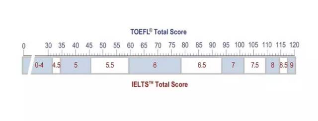 托福雅思分数转化器,是由ETS官方收集了1153名同时参加过托福和雅思考试的考生成绩数据研制而成的。水平方向移动下方图示中的蓝色尺标即可获取托福分数(0-120分),所对应的雅思分数(0-9分)。